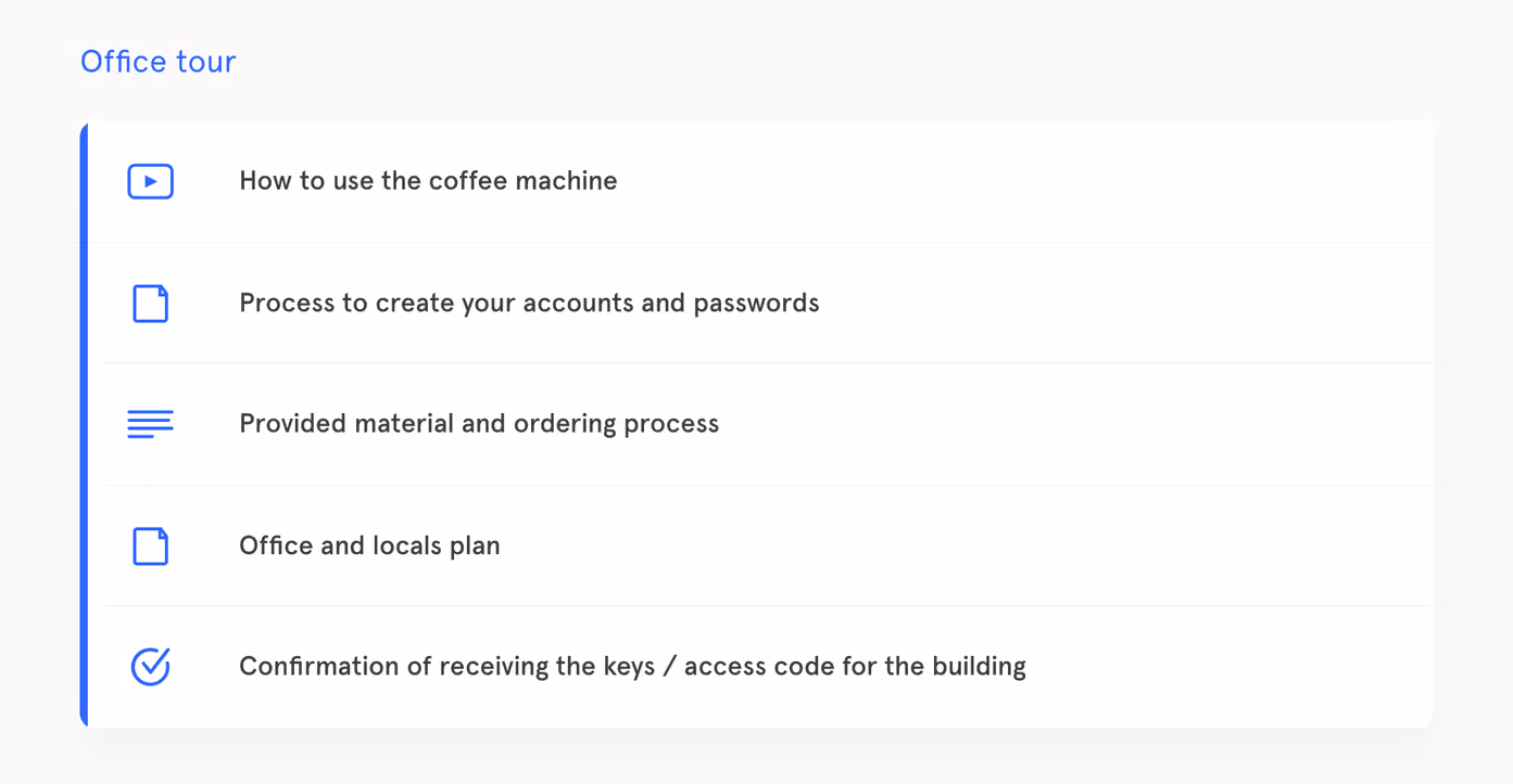 You can add to the course a plan of the office and even some procedures for creating passwords and ordering equipment.