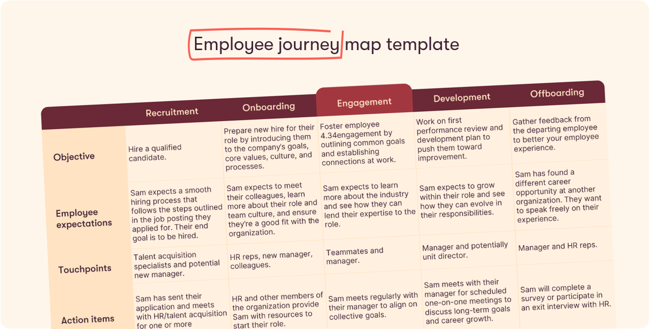- Locate problem areas: Once you see the employee journey map through the eyes of all your employees, you can see what issues they have. For example, an employee might be struggling to engage in their role after a few months due to a lack of team alignment.
