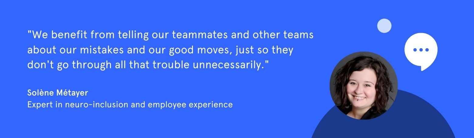 - A lot of resources, time and energy are wasted because employees do not share what they do with colleagues. However, all they would have to do is talk about their mistakes and successes to their teammates or other teams, so that they wouldn’t have to redo all the unnecessary steps. Their testimonies could be documented in many ways, such as via an internal knowledge management system, for example.