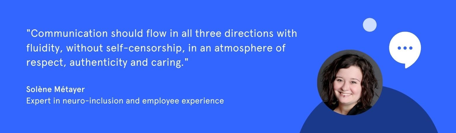 When applied to workplace communication, this means that communication should be done in all three directions, fluidly and without self-censorship. It is always good to create an atmosphere of respect, authenticity and friendliness.