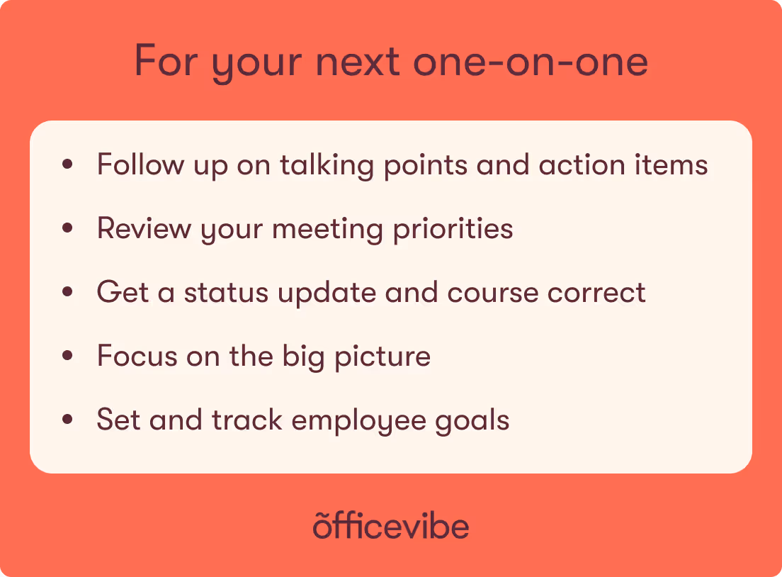 Use this as a tool that you can adapt depending on the type of conversation you might want to have, and make sure you cover what’s most important. This will help you run better one-on-one meetings, keep up with all your employee's needs, and support an engaged, high-performing team.