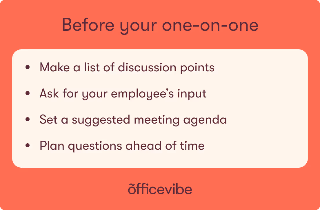 Remember that a one-on-one meeting is a dedicated space for you to listen and receive employee feedback. Keep your meeting agenda as a loose structure, and let your employees express themselves. It’s their time to share and your time to learn about them, coach them when needed, and provide support.