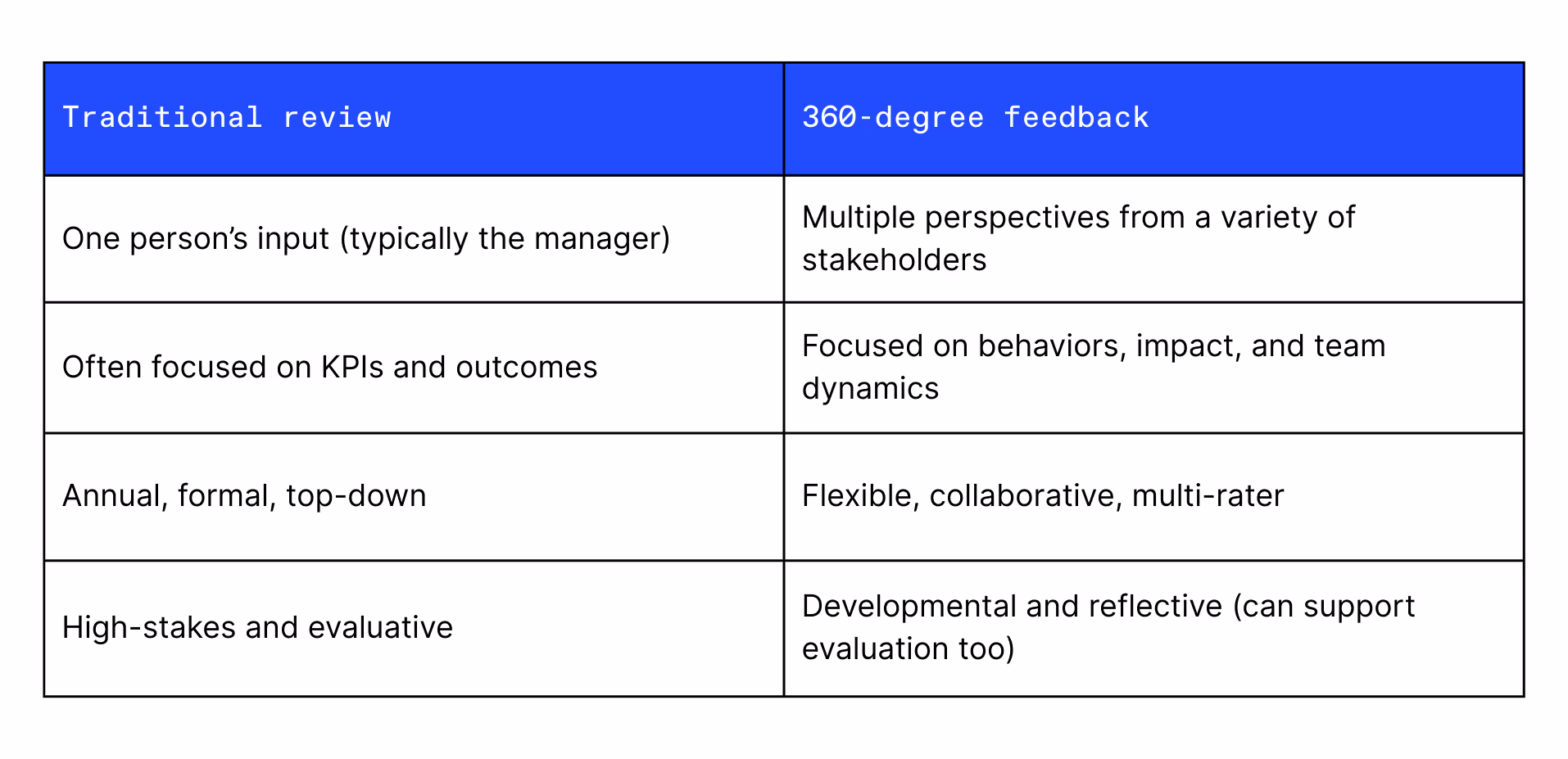 - It’s the only type of feedback review happening (it should complement regular check-ins and performance evaluation touchpoints)