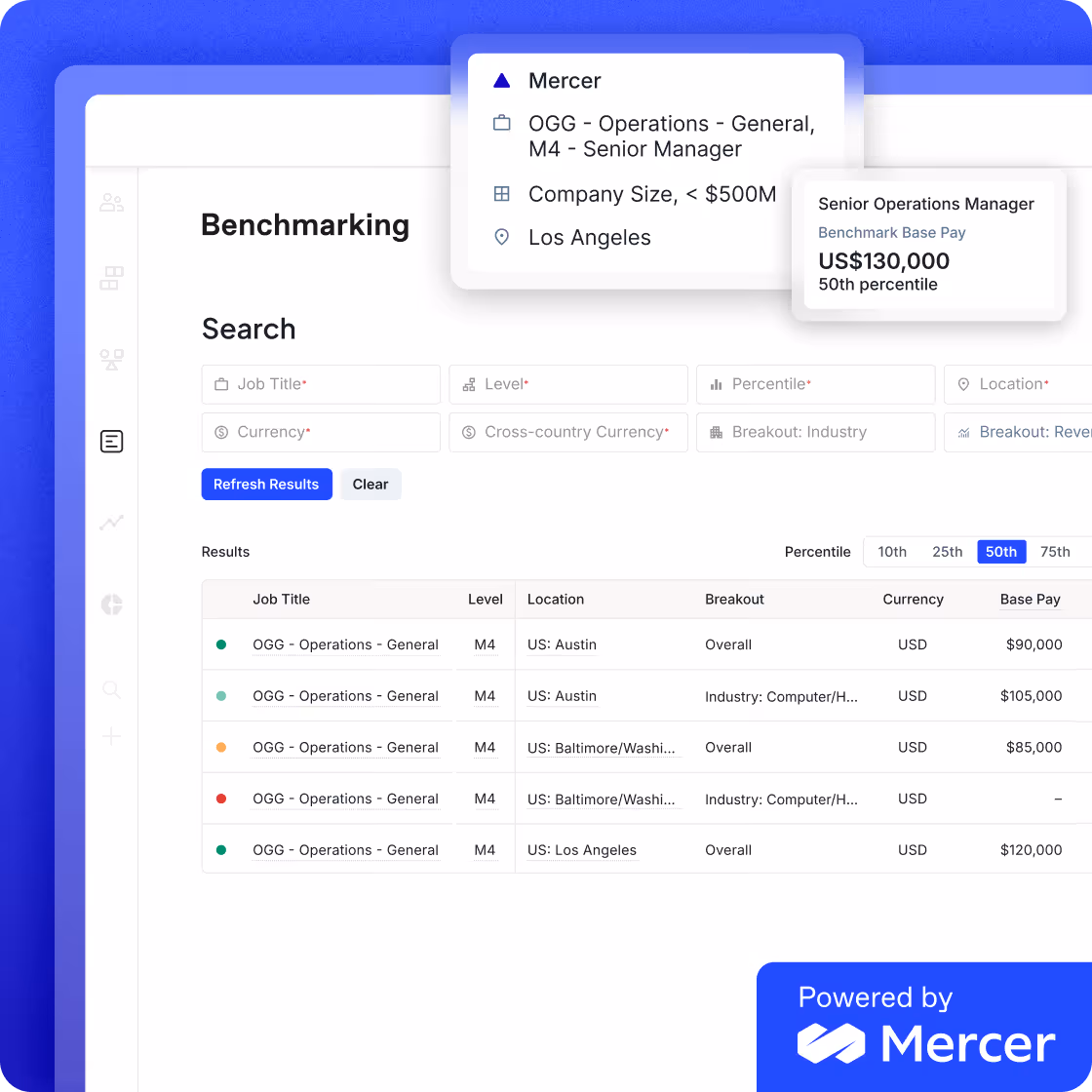 Access to trusted benchmarking data from Mercer so you can manage fair, competitive pay for all roles. - Pay band comparison