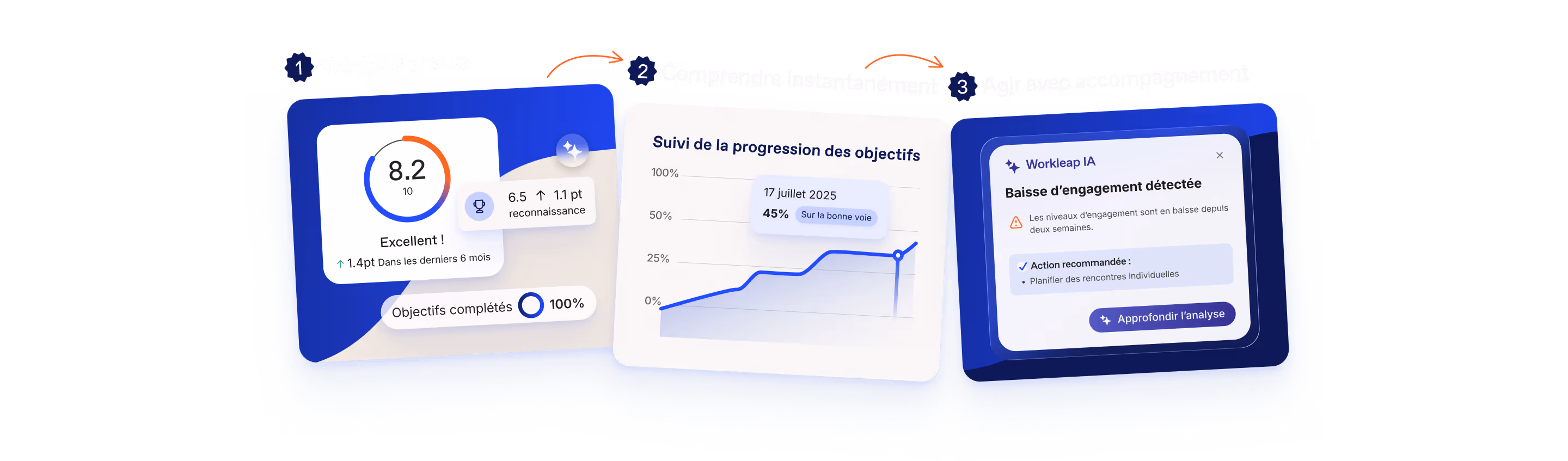 Chaque produit Workleap est enrichi de fonctionnalités IA qui vous aident à comprendre, prévoir et agir sur les données des employé·es. Des insights d’engagement aux résumés de performance, l’IA amplifie votre impact à chaque étape de la gestion des talents.