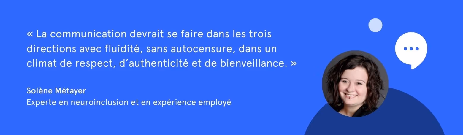 Dans le cadre de la communication en entreprise, ça signifie que la communication devrait se faire dans les trois directions avec fluidité, sans autocensure. Dans tous les cas, il serait bien d’instaurer un climat de respect, d’authenticité et de bienveillance.