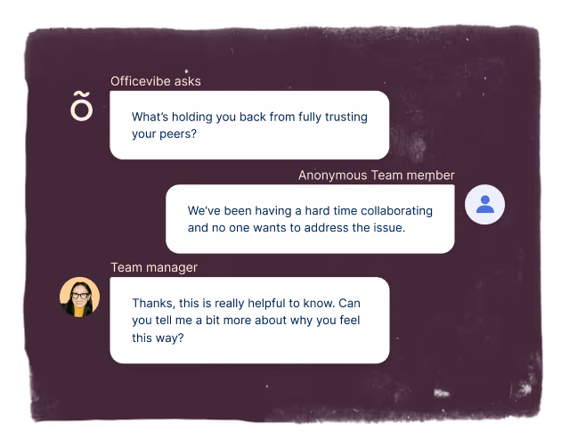 Vous êtes curieux de savoir comment Officevibe peut contribuer à ouvrir la voie à des conversations plus constructives ? En savoir plus sur notre messagerie de commentaires intégrée à l'application, nos conseils de feedback et une liste d'autres outils qui peuvent vous aider à mieux comprendre les besoins de votre personnel.