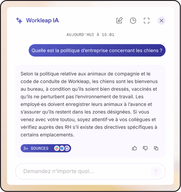 La meilleure façon de comprendre l’IA, c’est de l’essayer. Commencez avec des assistants conversationnels (comme ChatGPT, Gemini ou Copilot) pour automatiser des tâches simples comme la rédaction d’offres d’emploi ou l’analyse de sondages. Ensuite, testez des outils RH alimentés par l’IA, comme Workleap IA, qui peuvent se connecter à vos systèmes existants (SIRH, intranet, outils de productivité) et générer des résultats vraiment utiles.