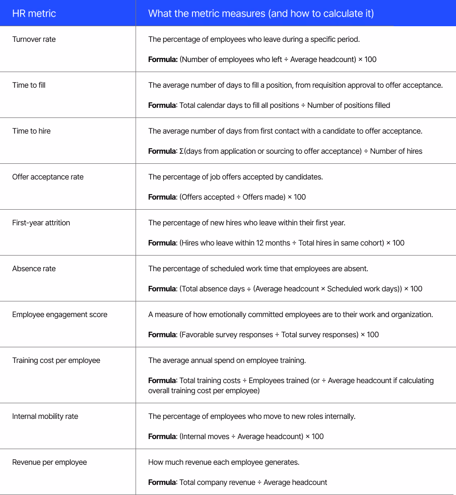 This is where workforce analytics becomes actionable. Applying the right metrics allows you to translate raw data into meaningful insights. While you’ll want to focus on the metrics that align with your original goal, several foundational metrics show up across most HR strategies.