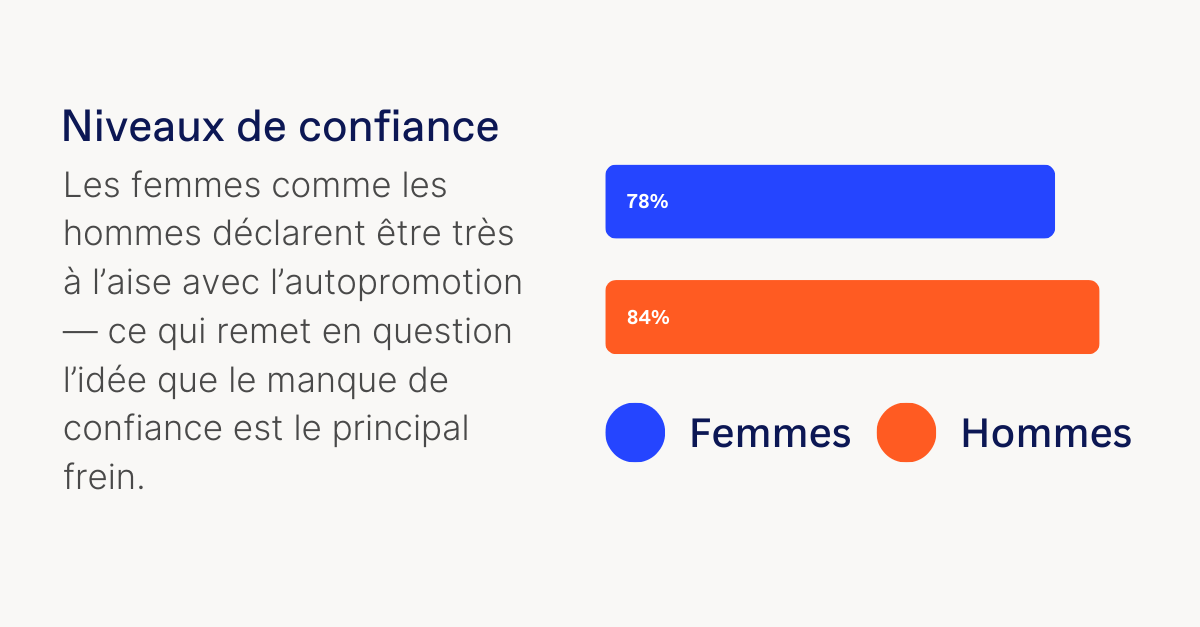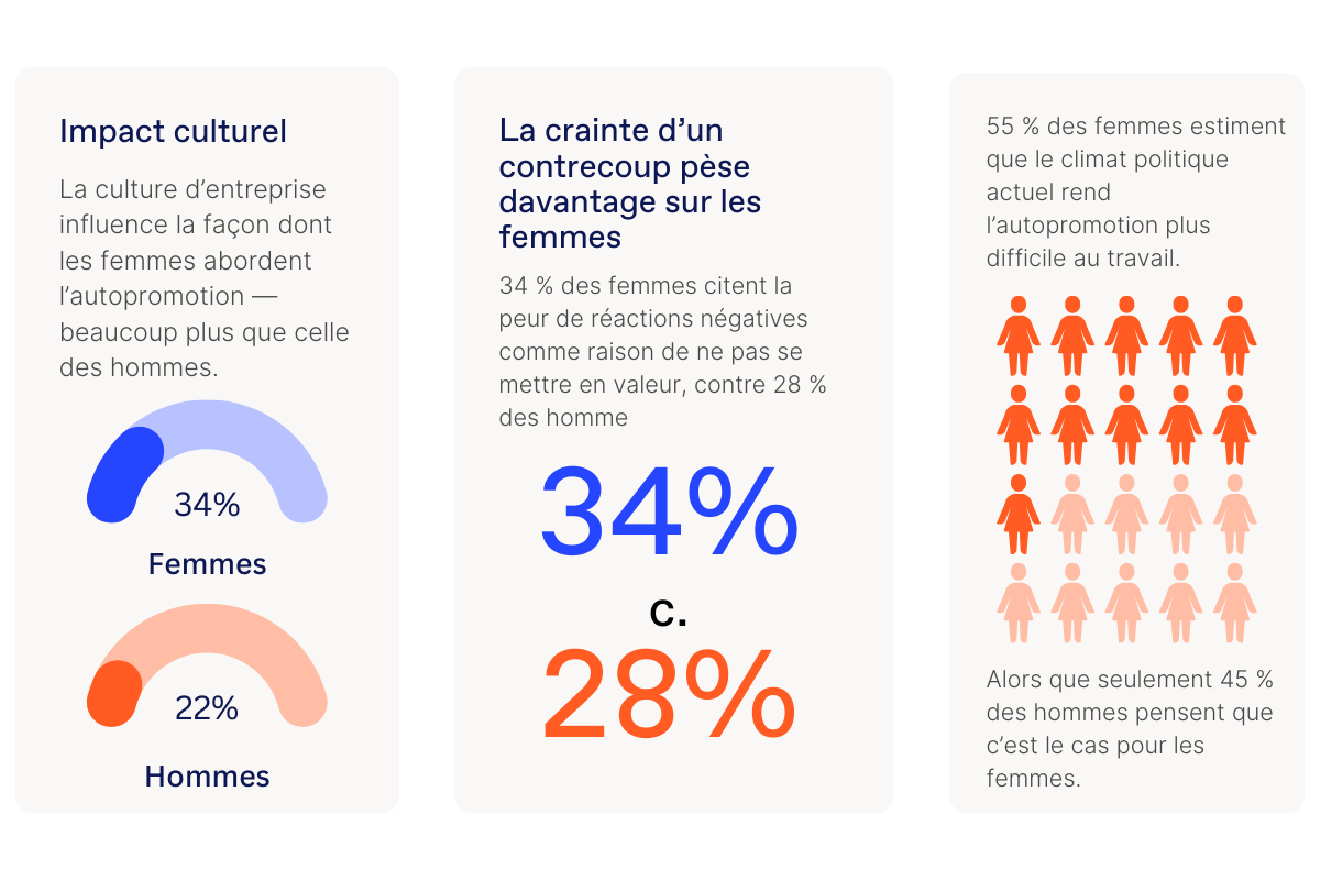 34 % des femmes disent que la culture du milieu de travail influence leur façon d’aborder l’autopromotion, contre 22 % chez les hommes. - La crainte d’un effet négatif est plus présente.