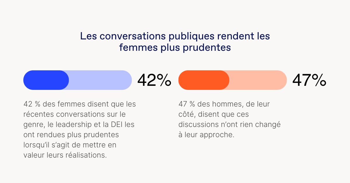 Le sondage révèle que 42 % des femmes affirment que les récentes conversations sur le genre, le leadership et la DEI les ont rendues plus prudentes lorsqu’il s’agit de mettre en valeur leurs réalisations. Près de la moitié des hommes (47 %) disent que ces discussions n’ont pas modifié leur approche.