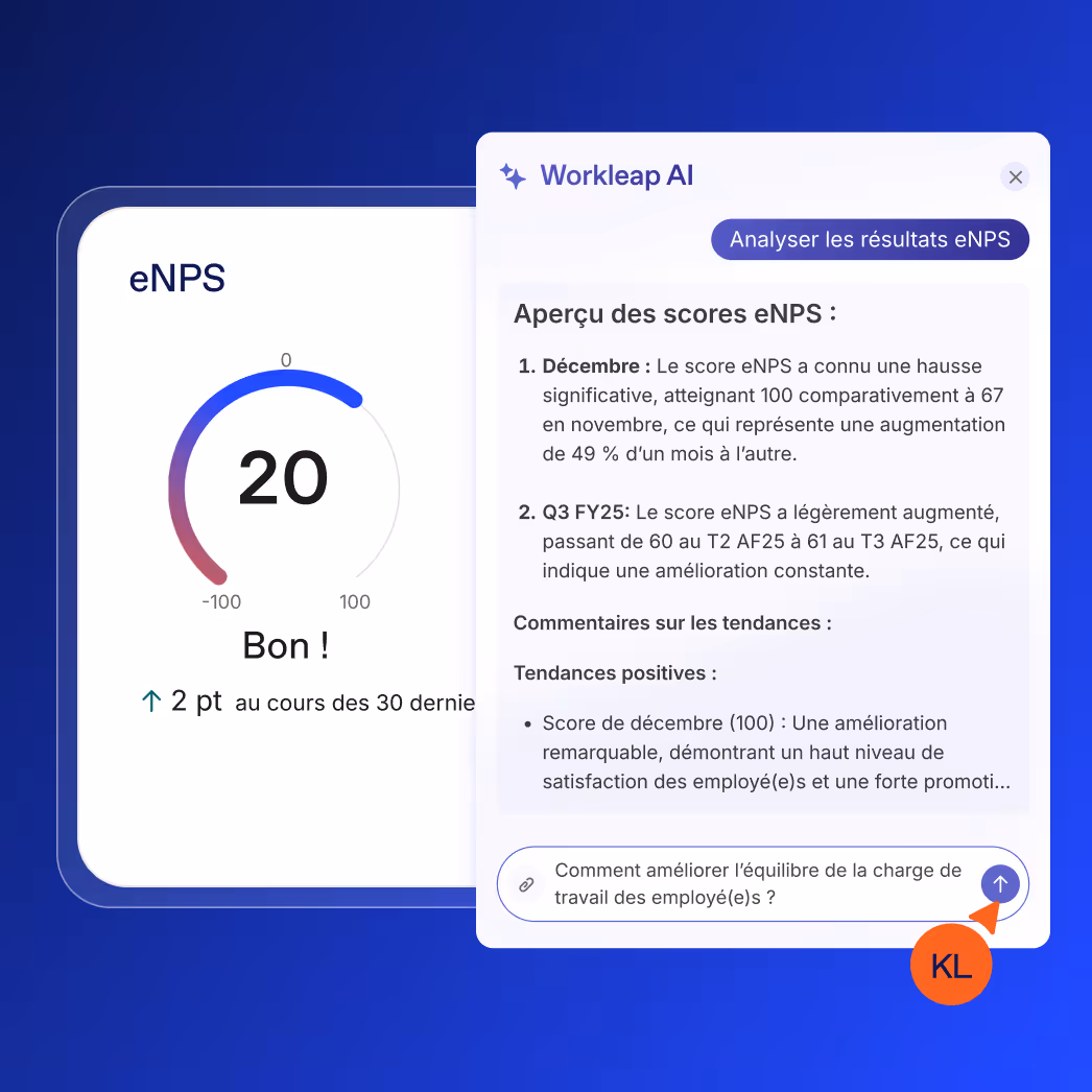 Obtenez des conseils expliquant les thèmes clés de vos résultats de sondage et suggérant des actions concrètes pour faire avancer les choses. Analysez l’engagement, le eNPS et la rétroaction avec des faits saillants, des pistes d’amélioration et des actions recommandées.