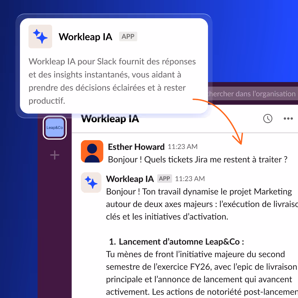 Workleap IA connecte toutes vos données à travers la plateforme Workleap, ainsi qu'à des applications issues d'outils professionnels tels que Slack, Confluence, SharePoint et Jira. Nous développons constamment de nouvelles intégrations !