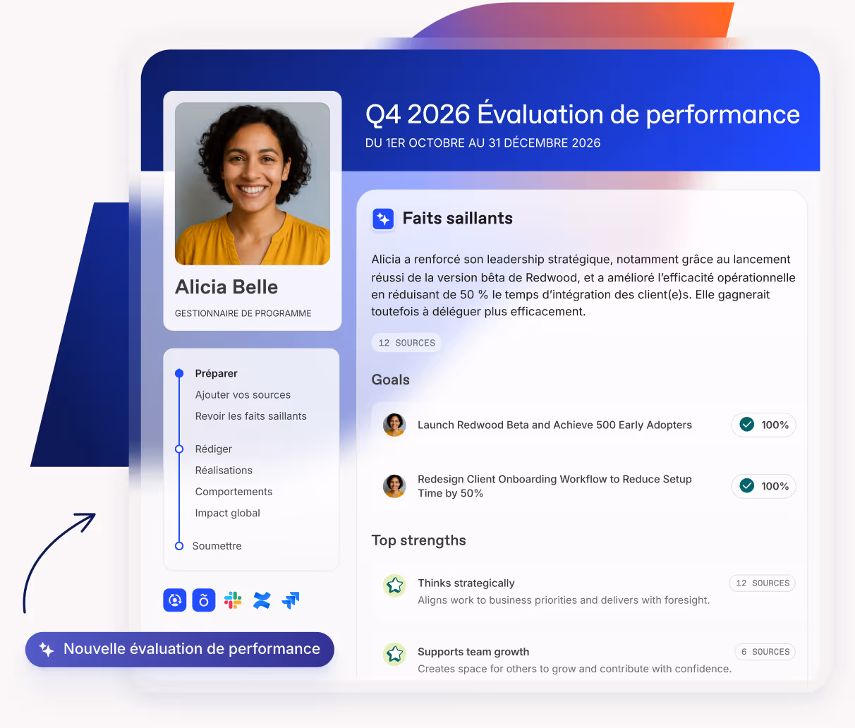 Workleap Performance s'intègre aux principaux systèmes SIRH pour rationaliser les données des employé·es et réduire les tâches administratives manuelles. Il se connecte également à Slack, ce qui permet aux équipes de recevoir facilement des rappels, de partager des mises à jour et de garder les objectifs visibles dans les flux de travail quotidiens.