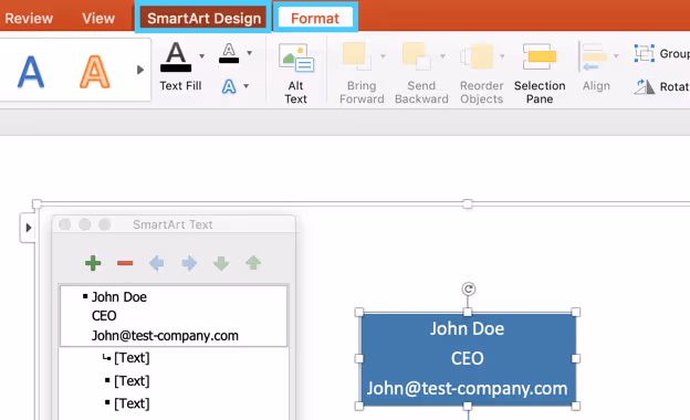 - If you want to change the size of your org chart, give your text a WordArt style, give your shapes a colored outline, or many other formatting updates, click the Format tab in the top ribbon.