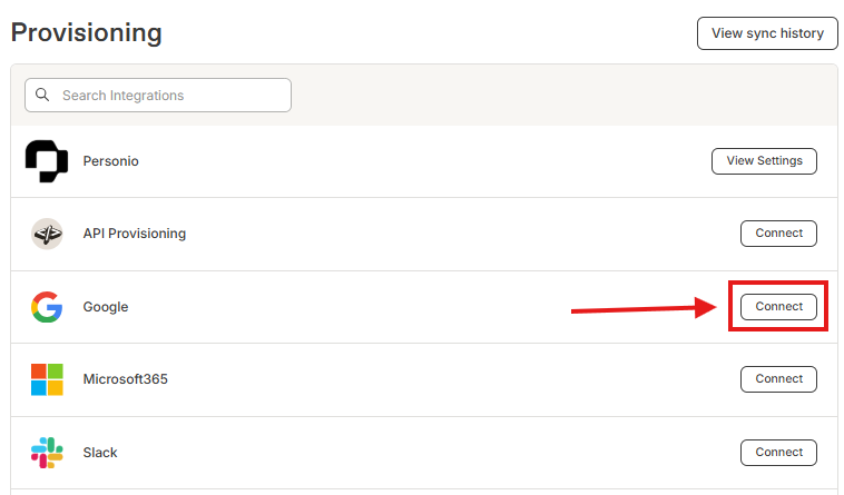 2. On the Provisioning settings page, search for Google Workspace and click Connect.
