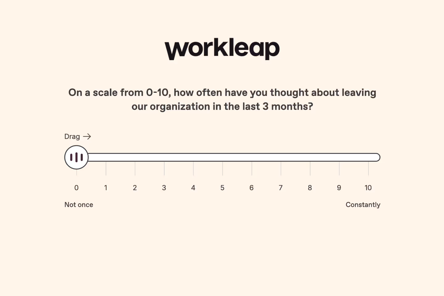 In just 10 minutes, this 9-question survey uncovers what employees value most about their roles, what challenges they face, and what might influence their decision to stay or leave. With a combination of open-ended text questions and opinion scale ratings, it captures both personal context and measurable sentiment.