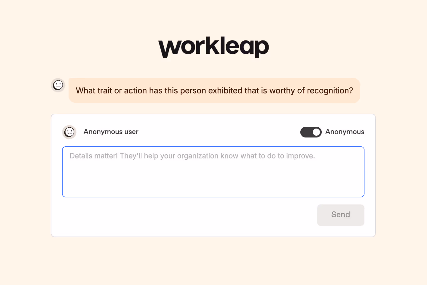 In just 10 minutes, this 4-question survey gives team members space to reflect and share who’s made a difference in their day-to-day work. Through thoughtfully crafted text-based prompts, employees can highlight acts of support, leadership, innovation, and collaboration that might otherwise go unrecognized.